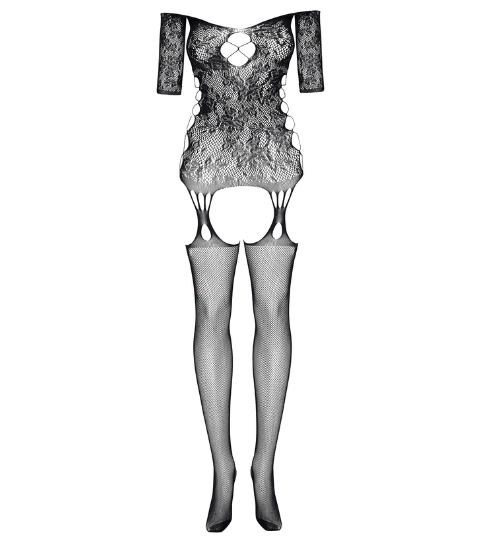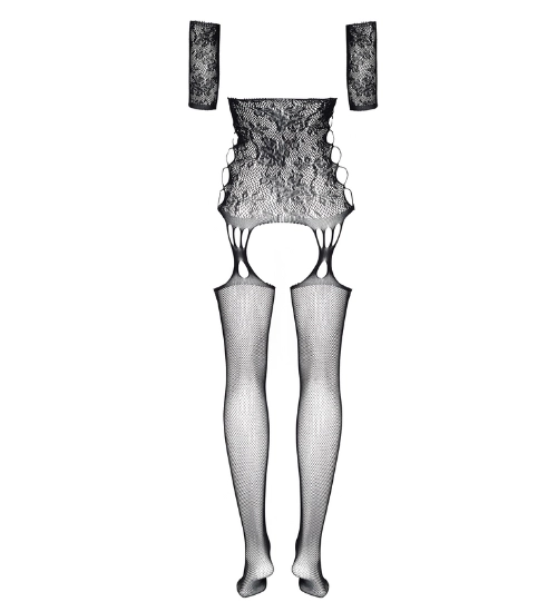 Elastyczny materiał zapewnia doskonałe dopasowanie, dzięki czemu bielizna prezentuje się idealnie na każdej sylwetce. Krótkie rękawy delikatnie okrywają ramiona, a seksowne rozcięcia po bokach z krzyżowymi przeszyciami odsłaniają biodra, tworząc niezwykle kuszący efekt. Całość uzupełniają zintegrowane pończochy, które dopełniają zmysłowy charakter tego modelu.