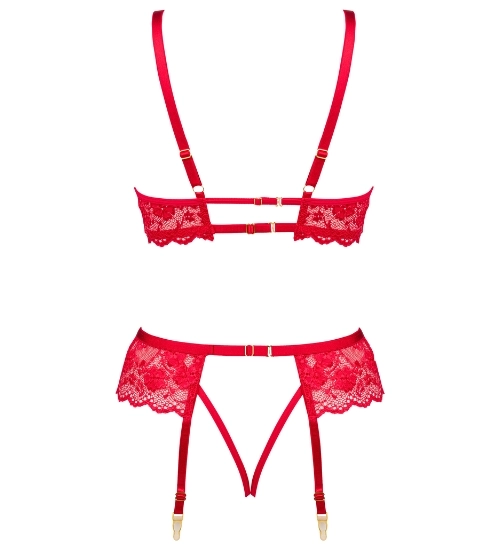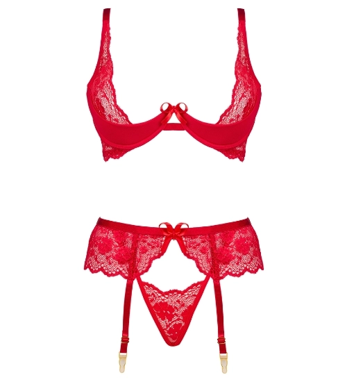 Intensywna czerwień, delikatna koronka i perfekcyjne dopasowanie – ta bielizna, mówi więcej niż słowa. Trzyczęściowy komplet łączy w sobie zmysłowy design z eleganckim wykończeniem. Przezroczyste tkaniny otulają ciało, tworząc kuszącą kompozycję, która przyciąga spojrzenia i rozpala wyobraźnię.