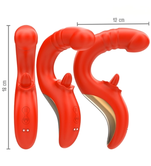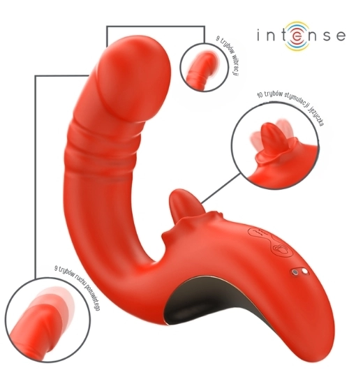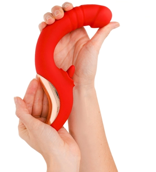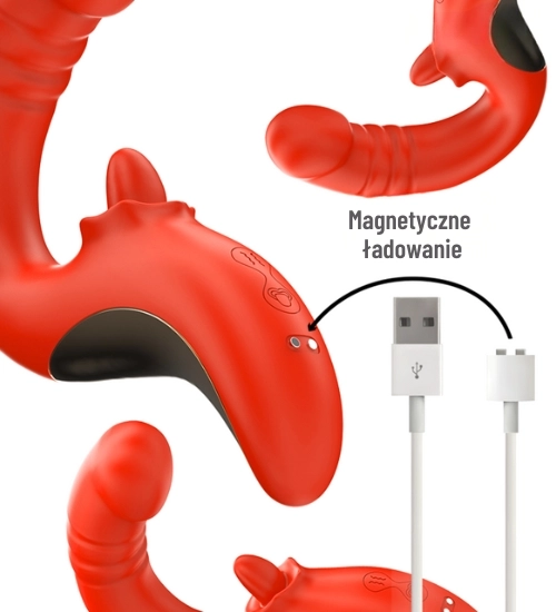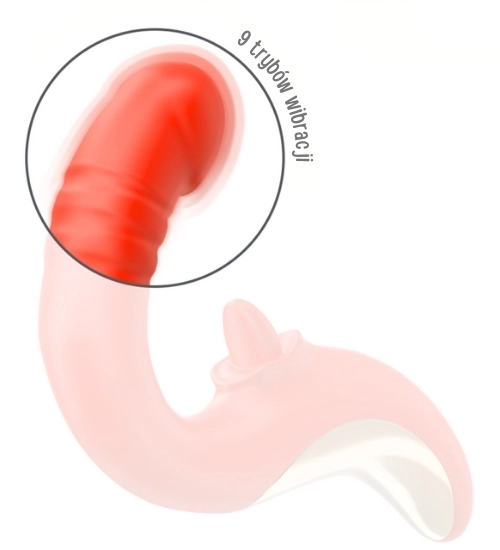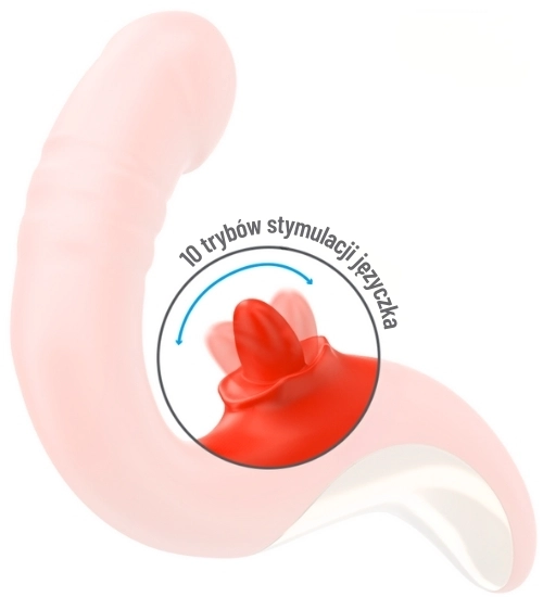 Czerwony wibrator z ruchomym języczkiem oferuje intensywne doznania zarówno wewnętrzne, jak i zewnętrzne. Dwa niezależne silniki odpowiadają za podwójną stymulację: jeden steruje wibracjami oraz ruchami góra-dół części masującej punkt G, a drugi wprawia w ruch języczek wykonujący okrężne ruchy w aż 10 trybach. Dzięki temu każda chwila z tym gadżetem staje się wyjątkowo zmysłowa i pełna przyjemności.