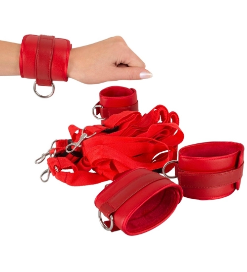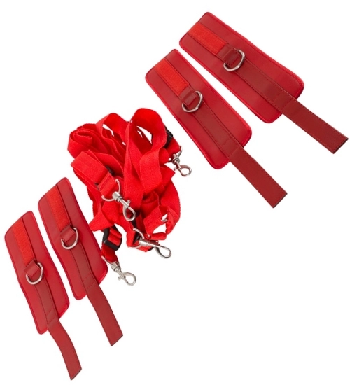 Czerwony zestaw do krępowania na łóżko został stworzony, by rozpalić wyobraźnię i dodać ognia do sypialnianych spotkań. Pasuje do każdego łóżka, nawet takiego bez poręczy, ponieważ jego konstrukcja opiera się na pasach wsuwanych pod materac. To rozwiązanie sprawia, że granice ruchu znikają, a ciało staje się poddane przyjemnej kontroli.