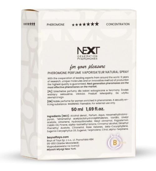 Luksusowe feromony damskie o uwodzicielskim zapachu. Stworzona mieszanka zapachowa tworzy erotyczną aurę, która działa wabiąco na mężczyzn. Ten wyjątkowy aromat budują nuty frezji, czarnej porzeczki, róży oraz paczuli. Współpraca ze światowymi specjalistami, poparta dziewięcioletnimi badaniami, umożliwiła stworzenie luksusowego zapachu.
