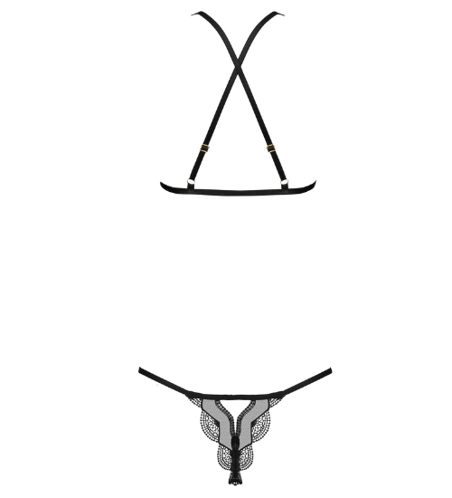 Top z regulowanymi krzyżującymi się na plecach ramiączkami dobrze dopasowuje się do sylwetki, a koronkowe wykończenie w w górnej części pięknie akcentuje biust. Wycięcia w talii optycznie modelują kształty i dodają całości charakteru. Komplet uzupełniają stringi, które współgrają z górą i podkreślają biodra, tworząc spójną, przemyślaną całość.