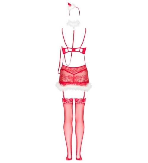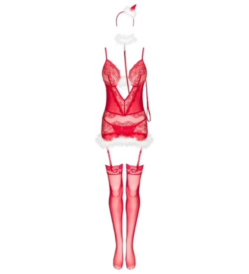 Zestaw składa się z aż pięciu części i tworzy pełną stylizację idealną dla świątecznej Mikołajki. W komplecie znajduje się koszulka, stringi, pończochy, opaska oraz choker ze smyczą. Elastyczny materiał dopasowuje się do ciała i zapewnia wygodę. Koronka i tiul tworzą zgrabny, przyciągający uwagę efekt.