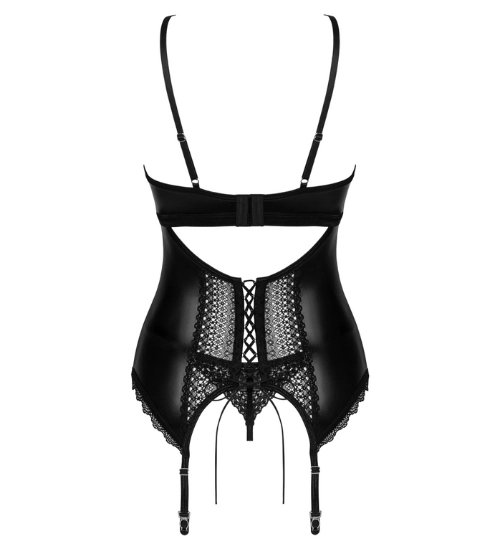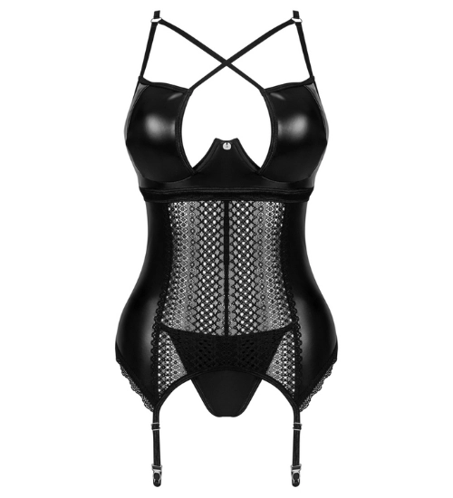 Całość uzupełniają stringi, które doskonale współgrają z gorsetem. Regulowane paski do pończoch dodają bieliźnie drapieżnego charakteru, pozwalając na stworzenie pełnej stylizacji z ulubionymi pończochami. Elastyczny materiał zapewnia komfort i swobodę ruchów, dzięki czemu bielizna nie tylko wygląda efektownie, ale również świetnie sprawdza się podczas noszenia.
