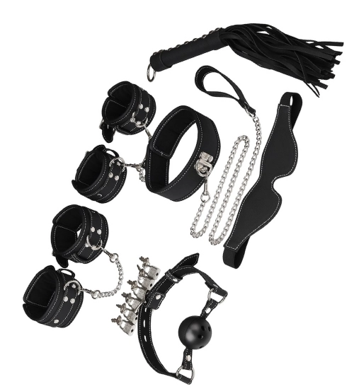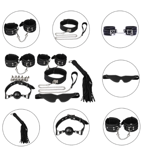 - składa się z: kajdanek na ręce i nogi, obroży ze smyczą, pejcza, opaski na oczy, knebla oraz zestawu 6szt metalowych kłódek