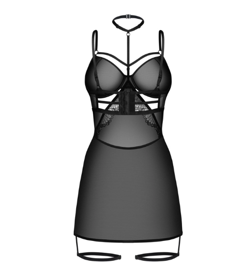 Siateczkowa koszulka z paskami łączy w sobie elegancję i zmysłowości w nowoczesnym wydaniu. Przejrzysty materiał delikatnie otula ciało, subtelna koronka pod biustem dodaje uroku, a miękkie miseczki na fiszbinach pięknie modelują piersi i nadają im kuszący kształt. Całość uzupełnia ozdobny choker z regulowanym paskiem, który przyciąga spojrzenia i podkreśla linię szyi oraz ramion, tworząc efekt pełen intrygi.
