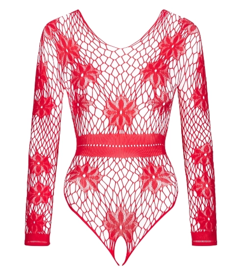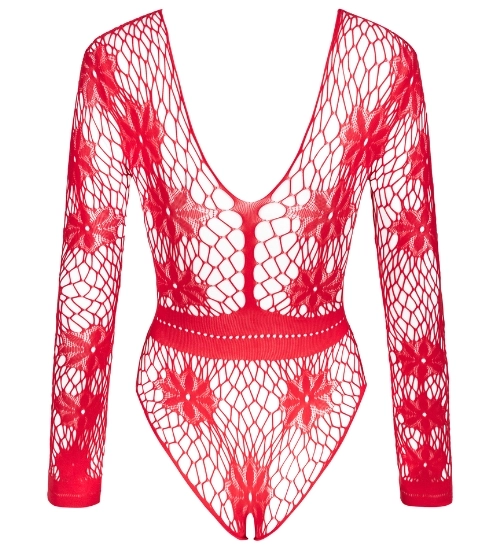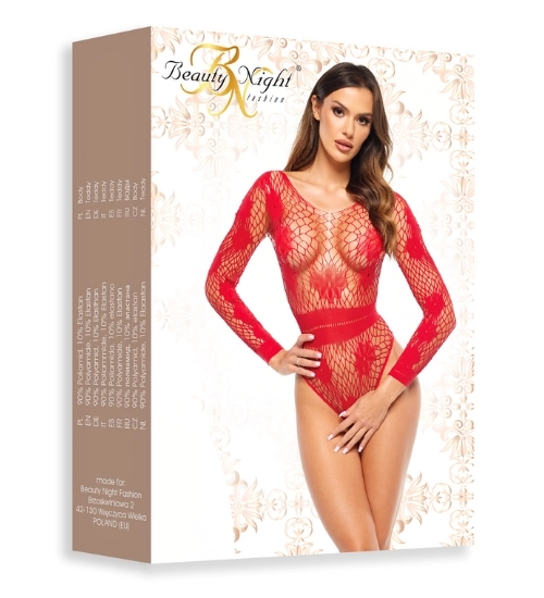 Body red z długim rękawem to zmysłowa propozycja stworzona z lekkiej, czerwonej siateczki, ozdobionej kwiatowym motywem. Wyrazisty kolor i transparentna faktura tkaniny nadają całości odważnego, ale nieprzesadzonego charakteru. Delikatny materiał przylega do ciała podkreślając kobiecą talię oraz eksponując plecy lub biust dzięki głębokiemu wycięciu.