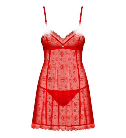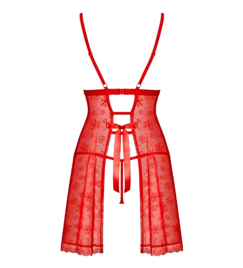 Sukienka grzesznej Mikołajki została stworzona z myślą o gorącej, świątecznej magii. Delikatna koronka ozdobiona motywem śnieżynek i świąteczny kolor sprawiają, że bielizna nabiera wyjątkowego charakteru. Białe pompony umieszczone nad piersiami dodają uroku i świątecznego wdzięku, a błyszcząca ozdoba pod biustem subtelnie podkreśla zmysłowy styl bielizny.