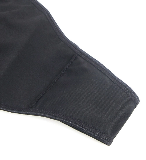 Półprzezroczysta wstawka z koronki odsłania ciało i przyciąga wzrok. Ciekawy kontrast tworzy połączenie lekkiej koronki z czarną, błyszczącą tkaniną przypominającą skórę. Całość uzupełniają paski przy dekolcie, które mocno podkreślają biust.