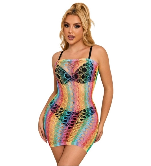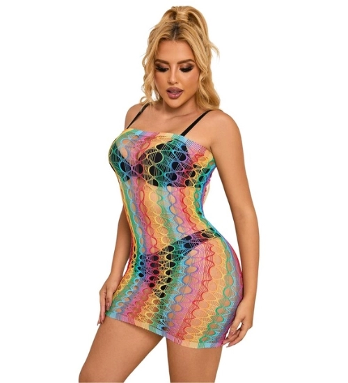 Tęczowa ażurowa sukienka przyciąga wzrok intensywną grą kolorów i wyjątkową strukturą. Wykonana z elastycznego, miękkiego materiału otula ciało niczym druga skóra, podkreślając każdą krągłość. Ażurowy splot tworzy zmysłowy efekt, który pobudza wyobraźnię i wprowadza atmosferę pełną napięcia.