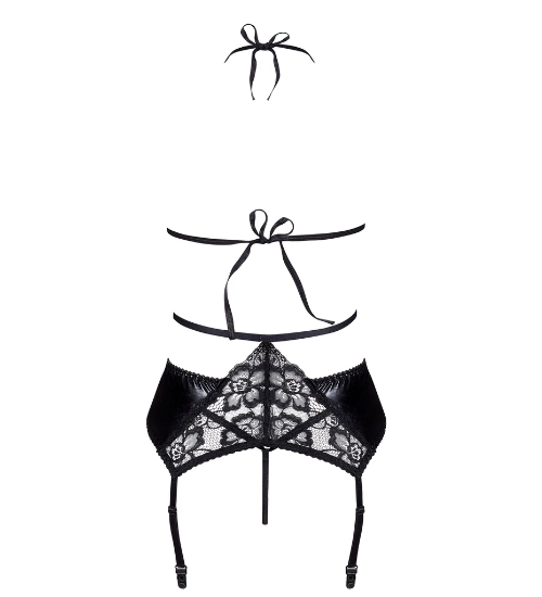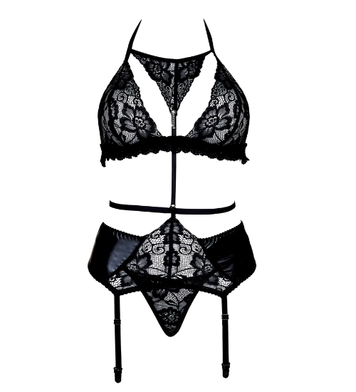Trzyczęściowy koronkowy komplet bielizny łączy w sobie klasyczną elegancję z wyrazistą zmysłowością. Czarna koronka o kwiatowym wzorze harmonijnie łączy się z błyszczącym materiałem, tworząc spójny i niezwykle kobiecy efekt. Trzyczęściowa forma kompletu pięknie eksponuje sylwetkę i nadaje bieliźnie luksusowego charakteru.
