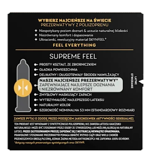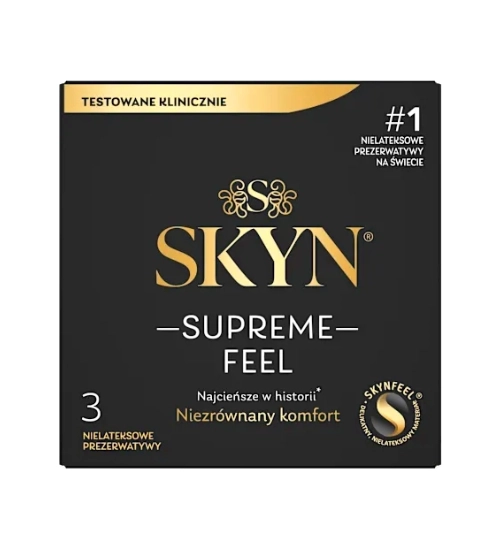 Ultracienkie SKYN Supreme Feel to najcieńsze prezerwatywy nielateksowe spośród wszystkich prezerwatyw marki SKYN. Wykonane z innowacyjnego materiału SKYNFEEL, są niezwykle miękkie i elastyczne, dzięki czemu idealnie dopasowują się do ciała. To rozwiązanie, które zapewnia naturalne odczucia i pozwala przeżywać intymne chwile w niemal nieodczuwalny sposób.