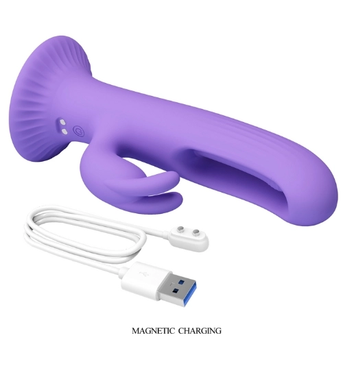 Wielofunkcyjny fioletowy wibrator na przyssawce wyróżnia się wśród innych tego typu gadżetów erotycznych nowoczesnym wyglądem i zaawansowanymi funkcjami, które gwarantują wyjątkowe doznania. Wykonany z miękkiego, bezpiecznego silikonu klasy premium, jest delikatny w dotyku i łatwy do utrzymania w czystości. Dzięki wbudowanemu akumulatorowi urządzenie działa bezprzewodowo, a magnetyczne ładowanie zapewnia komfort użytkowania i pełną wygodę.