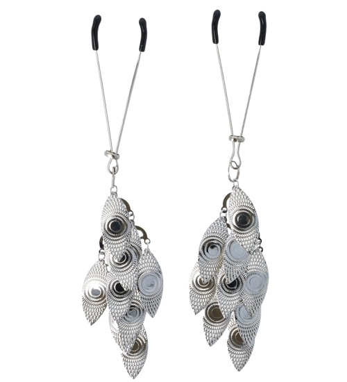 Stworzone z myślą o kobietach ceniących stymulację piersi. Już samo noszenie klipsów powoduje wzrost pobudzenia seksualnego, dodaje pewności siebie oraz wzmacnia przyjemność czerpaną ze zbliżeń. Prosta konstrukcja regulacji zacisku sprawi, że sama możesz dobrać siłę z jaką zacisk ma oddziaływać na Twoje piersi. Biżuteria nie powoduje otarć delikatnej skóry sutków - końcówki zacisków pokryte są miękkim materiałem. Klipsy zaś wykonano z metalu wolnego od niklu w przepięknym kolorze srebra. Do zacisków dołączono oryginalne lekkie zawieszki w kształcie łez, które dźwięczą rytmicznie poruszając się wraz z ciałem.