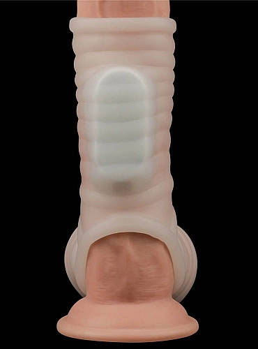 Jej estetyczny wygląd, dzięki żebrowanej konstrukcji, prezentuje się elegancko, a produkt jest starannie opakowany. Warto podkreślić, że nakładka jest wyposażona w wbudowany pocisk wibracyjny, zasilany jedną płaską baterią, która jest dołączona do zestawu.