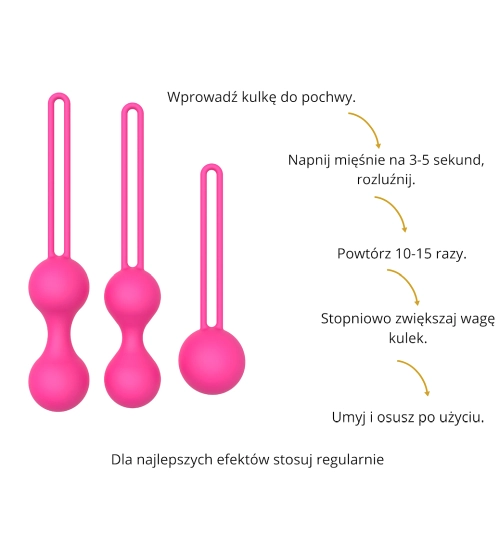 Zestaw kulek Kegla to doskonałe narzędzie do kompleksowego treningu mięśni dna miednicy, składający się z trzech różnych kulek, które umożliwiają dostosowanie ćwiczeń do indywidualnych potrzeb. Każda kulka ma inną wagę, co pozwala na stopniowe zwiększanie intensywności treningu: najcięższa kulka waży 64 g, środkowa 47 g, natomiast najlżejsza kulka waży 37 g. Dzięki tej różnorodności użytkowniczki mogą z łatwością przechodzić z lżejszych do cięższych kulek, co przyczynia się do efektywniejszego wzmacniania mięśni Kegla.