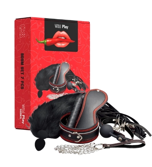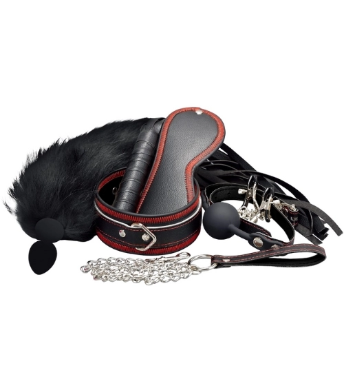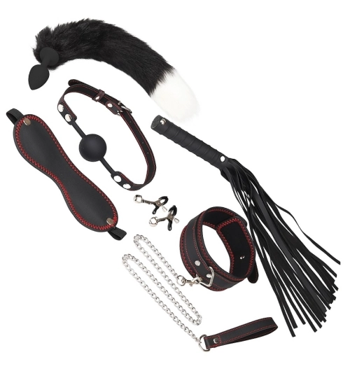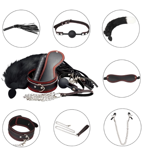 W skład kompletu wchodzą: knebel z silikonową kulką, obroża z elegancką smyczą, zaciski na sutki z ozdobnym łańcuszkiem, opaska na oczy, pejcz z miękkimi frędzlami, a także korek analny z puszystym ogonem. Taki dobór akcesoriów pozwala na różnorodne scenariusze zabawy. Od delikatnych pieszczot po intensywniejsze doznania. Opaska i knebel potęgują atmosferę podporządkowania, a pejcz, zaciski i obroża z łańcuchem umożliwiają grę w pełną kontrolę i uległość.