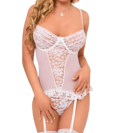 Szykowny biały gorset. Wysokiej jakości elastyczna tkanina, oplata ciało podkreślając jego kształty. Bielizna posiada bardzo seksowny krój. Koronkowy dekolt oraz wycięcie w kształcie litery V zachęcająco eksponuje piersi oraz optycznie wysmukla sylwetkę. Dodatkowo fiszbiny pod biustem pięknie podtrzymują i modelują piersi. Cienkie ramiączka z możliwością regulacji długości gwarantują perfekcyjne dopasowanie się do kształtów ciała.