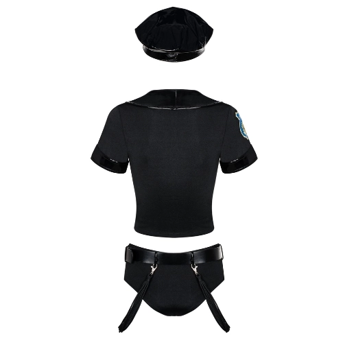 Seksowne i podniecające przebranie policjantki. Bluzeczka została pomysłowo ozdobiona winylowymi dodatkami. Kołnierzyk, mankiety, kieszonka na piersi oraz policyjne odznaki na prawym ramieniu i nad lewą piersią przykuwają wzrok.