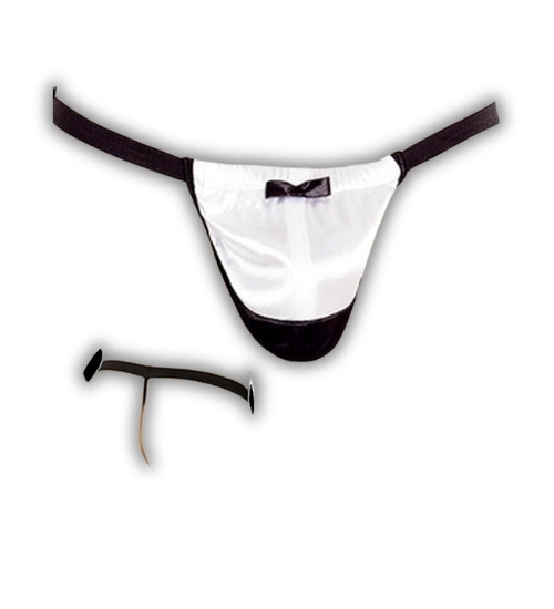 Przód bielizny to doskonałe połączenie czarnej i białej tkaniny, podkreślony delikatną muszką. Tył natomiast to cienkie paseczki, które zmysłowo podkreślają pośladki.