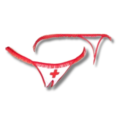 Pobudzające wyobraźnię i podkreślające kobiece ciało stringi to oryginalne uzupełnienie miłosnych gierek. Wykonany z błyszczącej czerwonej lycry krzyżyk stringi w biało czerwonych kolorach mogą także stanowić element większego przebrania.