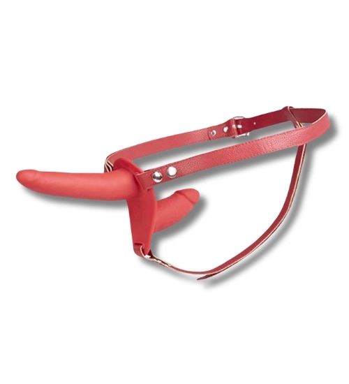 Czerwony kolor jest bardzo elegancki i wprowadzi powiew nowości do waszej sypialni. Produkt posiada dwa przeciwległe penisy, które wyprodukowano z silikonu. Paski gadżetu wykonano ze skóry ekologicznej. Załóż na siebie strap on a zobaczysz jak podniecisz partnera. Zabawka jest przeznaczona dla kobiet. Paski w rozmiarze uniwersalnym. Zaskocz swojego partnera lub partnerkę!