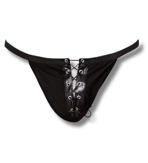 Czarne majteczki męskie typu string. Ozdobione ciekawym sznurowaniem z lamówką imitującą skórę. Z tyłu wykończone klasycznymi stringami.