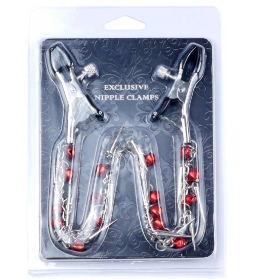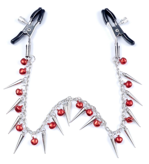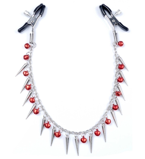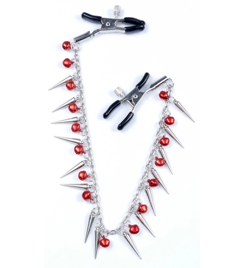 Proponowane zaciski do stymulacji sutków połączone zostały efektownym łańcuszkiem, który ozdobiony został metalowymi stożkami i seksownymi dzwoneczkami. Dzięki temu gadżet erotyczny zyskał bardziej biżuteryjny charakter. Polecamy go nowicjuszom oraz osobom wprawionym w zabawy tego typu. Regulacja siły nacisku sprawia, że dopasujesz poziom ekscytacji do prywatnych preferencji seksualnych. Klamry są odporne i przeznaczone także dla alergików.
