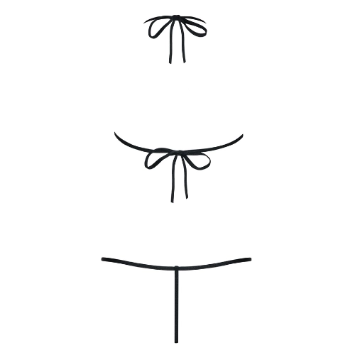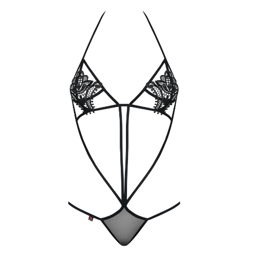 Bardzo efektowna bielizna erotyczna. Wykonana z półprzezroczystej tkaniny, bardzo przyjemnej w dotyku. Cienkie paseczki zmysłowo podkreślają kobiece ciało. Kwiatowe aplikacje na miseczkach kusząco akcentują piersi.