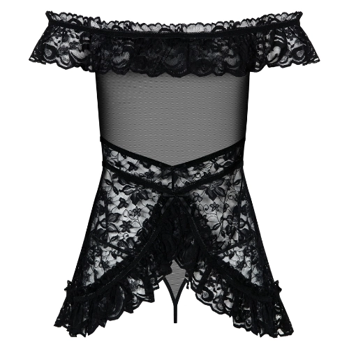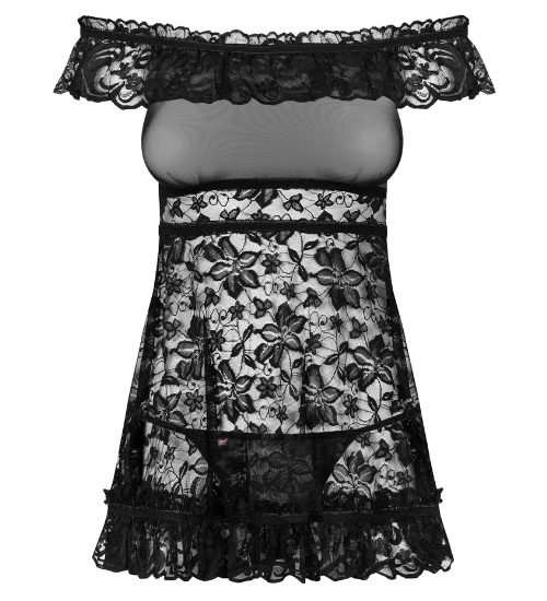 Koronkowe ramiączka mogą być noszone tradycyjnie lub ponętnie opuszczone na ramiona. Prześwitująca tkanina na biuście z pewnością rozpali zmysły Twojego partnera.